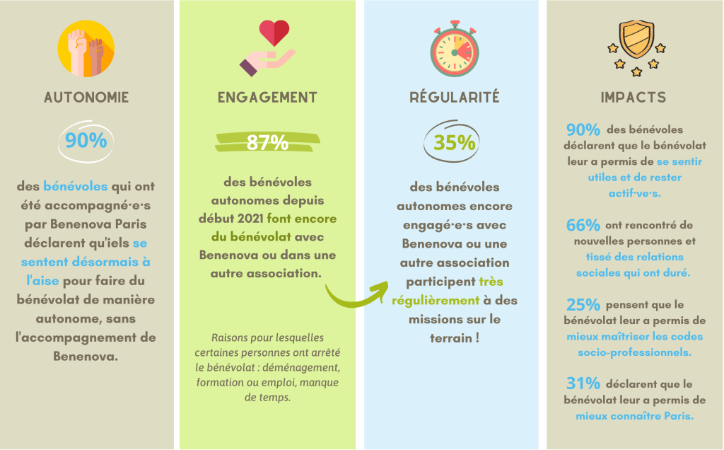 Une fois les bénévoles autonomes, nous avons mis en place deux bilans sous forme de questionnaires, administrés à la fin de l’accompagnement et 6 mois après, afin de prendre de leurs nouvelles. Les objectifs de ces bilans sont multiples : recueillir les avis des personnes sur l’accompagnement qui leur a été proposé, savoir si elles continuent de s’engager et de quelle manière, et comprendre les impacts que le bénévolat a pu avoir sur leur vie plus généralement !
